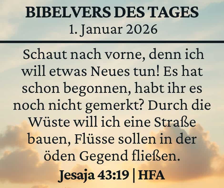 Schaut nach vorne, denn ich will etwas Neues tun! Es hat schon begonnen, habt ihr es noch nicht gemerkt? Durch die Wüste will ich eine Straße bauen, Flüsse sollen in der öden Gegend fließen.