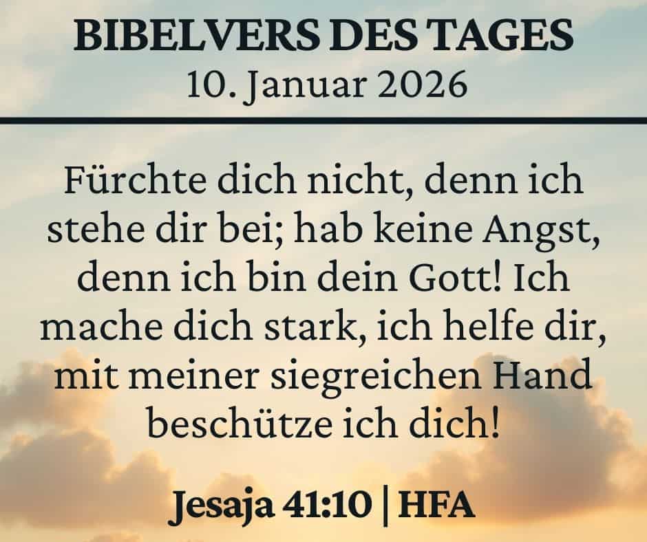 Fürchte dich nicht, denn ich stehe dir bei; hab keine Angst, denn ich bin dein Gott! Ich mache dich stark, ich helfe dir, mit meiner siegreichen Hand[a] beschütze ich dich!