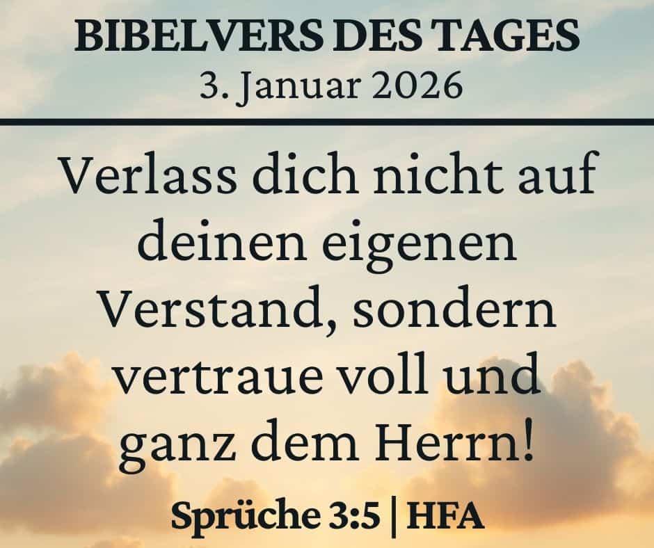 View Larger Image View Larger Image January 3 2026 Bible Verse2026-01-02T09:15:28+01:00 Project Description January 3 2026 Bible Verse Trust in the Lord with all your heart, and lean not on your own understanding; Proverbs 3:5 German Version Verlass dich nicht auf deinen eigenen Verstand, sondern vertraue voll und ganz dem HERRN! Sprüche 3:5 Project Details Skills Needed: Bible Verses Categories: Verse of the day Share This Story, Choose Your Platform! FacebookXRedditLinkedInWhatsAppTelegramTumblrPinterestVkXingEmail Related Projects January 10 2026 Bible Verse Gallery January 10 2026 Bible Verse January 9 2026 Bible Verse Gallery January 9 2026 Bible Verse January 8 2026 Bible Verse Gallery January 8 2026 Bible Verse January 7 2026 Bible Verse Gallery January 7 2026 Bible Verse