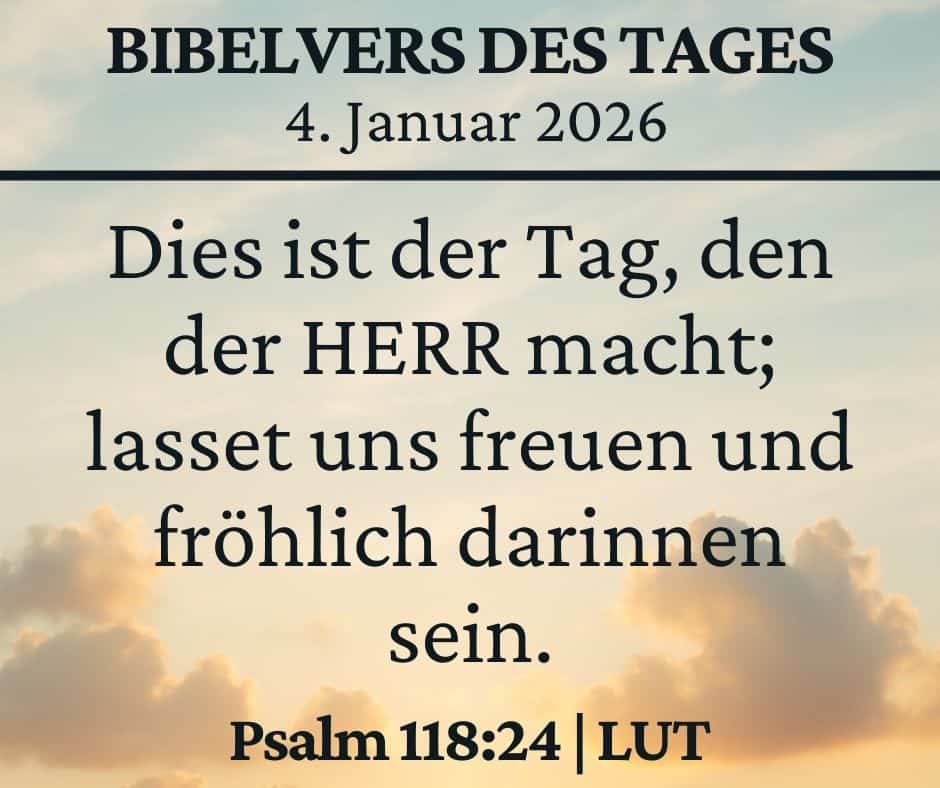 View Larger Image View Larger Image January 4 2026 Bible Verse2026-01-02T09:26:45+01:00 Project Description January 4 2026 Bible Verse This is the day that the Lord has made; we will rejoice and be glad in it. Psalm 118:24 German Version Dies ist der Tag, den der HERR macht; lasset uns freuen und fröhlich darinnen sein. Psalm 118:24 Project Details Skills Needed: Bible Verses Categories: Verse of the day Share This Story, Choose Your Platform! FacebookXRedditLinkedInWhatsAppTelegramTumblrPinterestVkXingEmail Related Projects January 10 2026 Bible Verse Gallery January 10 2026 Bible Verse January 9 2026 Bible Verse Gallery January 9 2026 Bible Verse January 8 2026 Bible Verse Gallery January 8 2026 Bible Verse January 7 2026 Bible Verse Gallery January 7 2026 Bible Verse